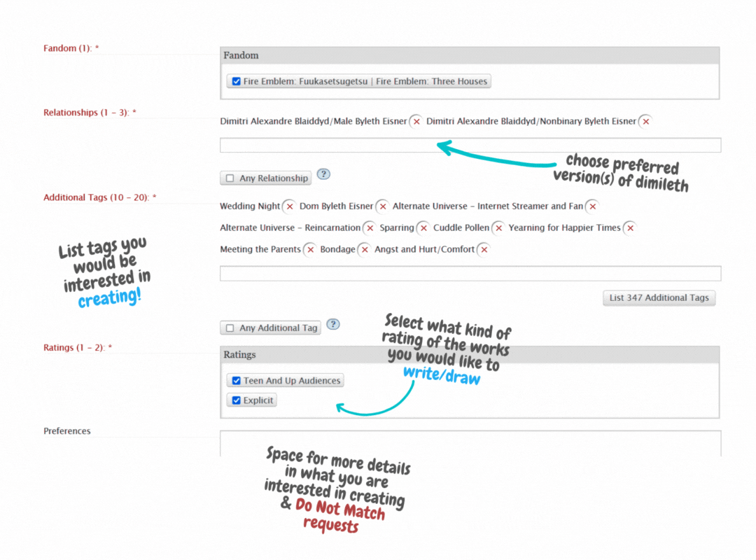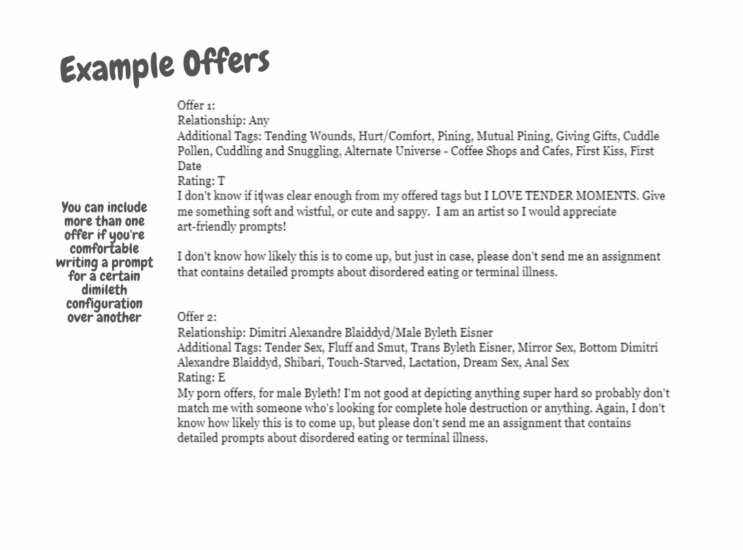 Fandom field: You have to check Three Houses here. That doesn’t mean you’re opting out of Three Hopes, it’s just AO3 weirdness.Relationships field: Use this field to indicate which versions of Byleth you’re interested in creating for. For example, if you’re happy to create for any version of Byleth, you would put all three available relationship tags in this field (or check Any).Additional Tags field: List things you would be interested in creating! If you run out of space you’re welcome to add a second offer. Avoid offering tags that you’re only interested in under very specific circumstances, as your recipient may have a different interpretation.If the tag list is too overwhelming, or you’re interested in too many tags: if you select “Any” and use the Optional Preferences field to describe broadly what you’re interested in creating, we'll match you based on your text. (Note that this is the only field we're doing special handling for Any on.)Ratings field: If you only want to create SFW, only select T. If you only want to create smut, only select E. To offer both SFW and NSFW, select both T and E. Your work does not need to match the exact rating you offered, this field is just for offering SFW versus NSFW.Optional Preferences field: You can add additional notes on what you’re interested in creating here, such as any broad tonal preferences that may not be captured in your tags, or things you really don't want to create. We’ll check these for incompatibility when reviewing the AO3-generated matches.You are guaranteed to be matched to someone who requested at least one of the relationships + additional tags + ratings you offered. They may have other prompts that don’t match anything you offered. If there’s something you would find highly distressing to read, such as prompts for noncon scenarios, let us know here and we will do our best to make sure your assignment doesn’t include it at all.
