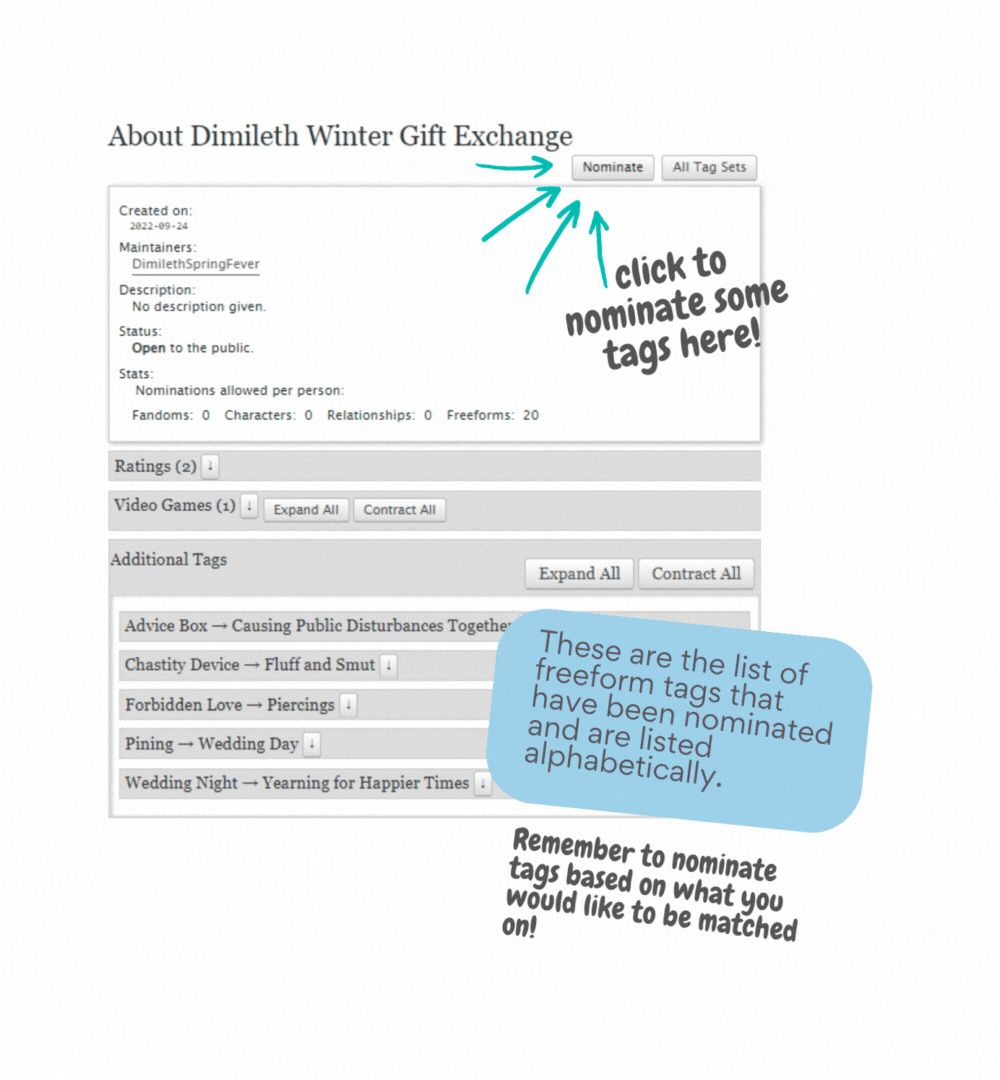 You are not required to nominate tags to be a part of the exchange.No one, not even the mods, can see what you have nominated–it is completely anonymous.
