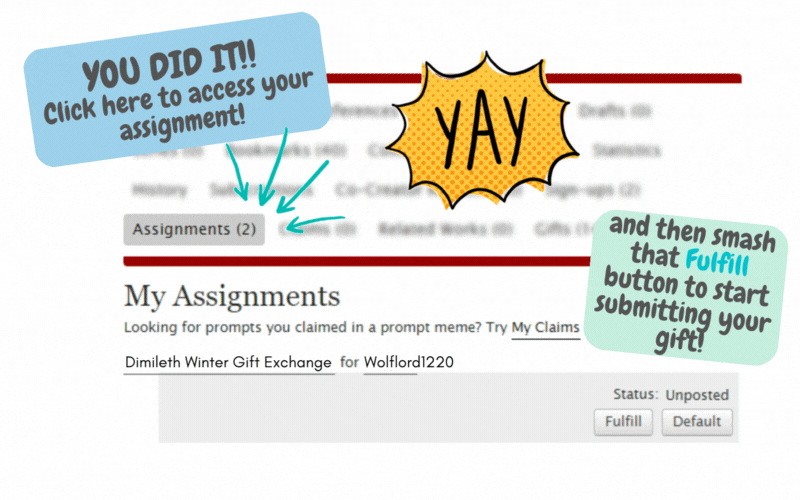 Go to your Assignments page on AO3 and hit the Fulfill button.This will take you to the "Post New Work" page—with your giftee's name and the collection already filled in. If the information is not there, just fill it out manually.From there, just post your fic/art piece as usual including all applicable tags and then give yourself a pat on the back!