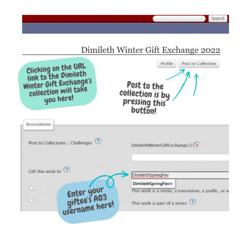To make sure the treat is part of the exchange and revealed with the other works, go to the exchange's AO3 page and click "Post to Collection" - this will take you to the new work page with DimilethWinterGiftExchange23 filled in as the collection.