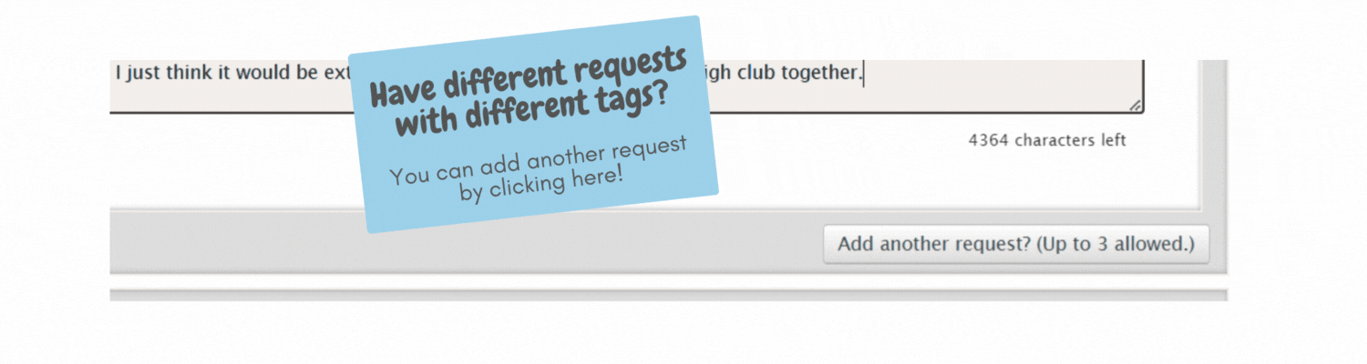 You can add more than one request if you’d like to split up which relationships, ratings, and tags you’re offering together.[What if there’s someone I don’t want to be matched with?] 💬