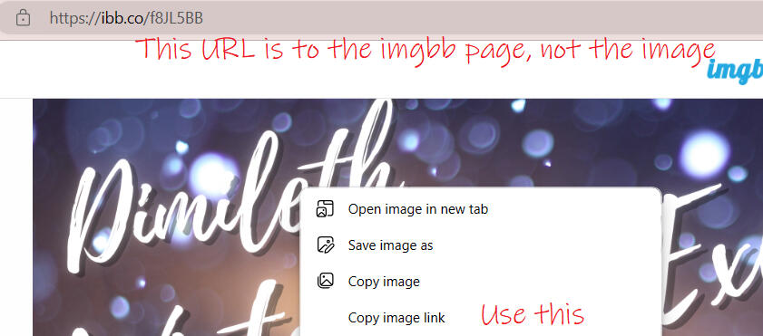 Sites like imgbb will give you a link to the imgbb page, not the actual image. All of imgbb's pregenerated link options are set up to get people to jump to imgbb instead of embedding the full image for viewing.To get an image link to give to AO3, open your image's imgbb page and right click the full image, then select "Copy image link" (or use "Open image in new tab" to launch the image in a tab where you can copy its URL from the address bar.)Image links will end with an image file extension, such as .jpg or .png.